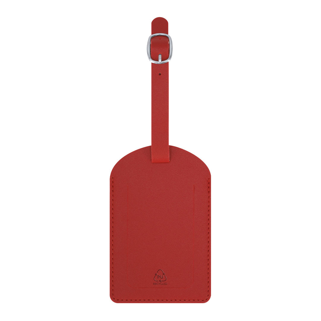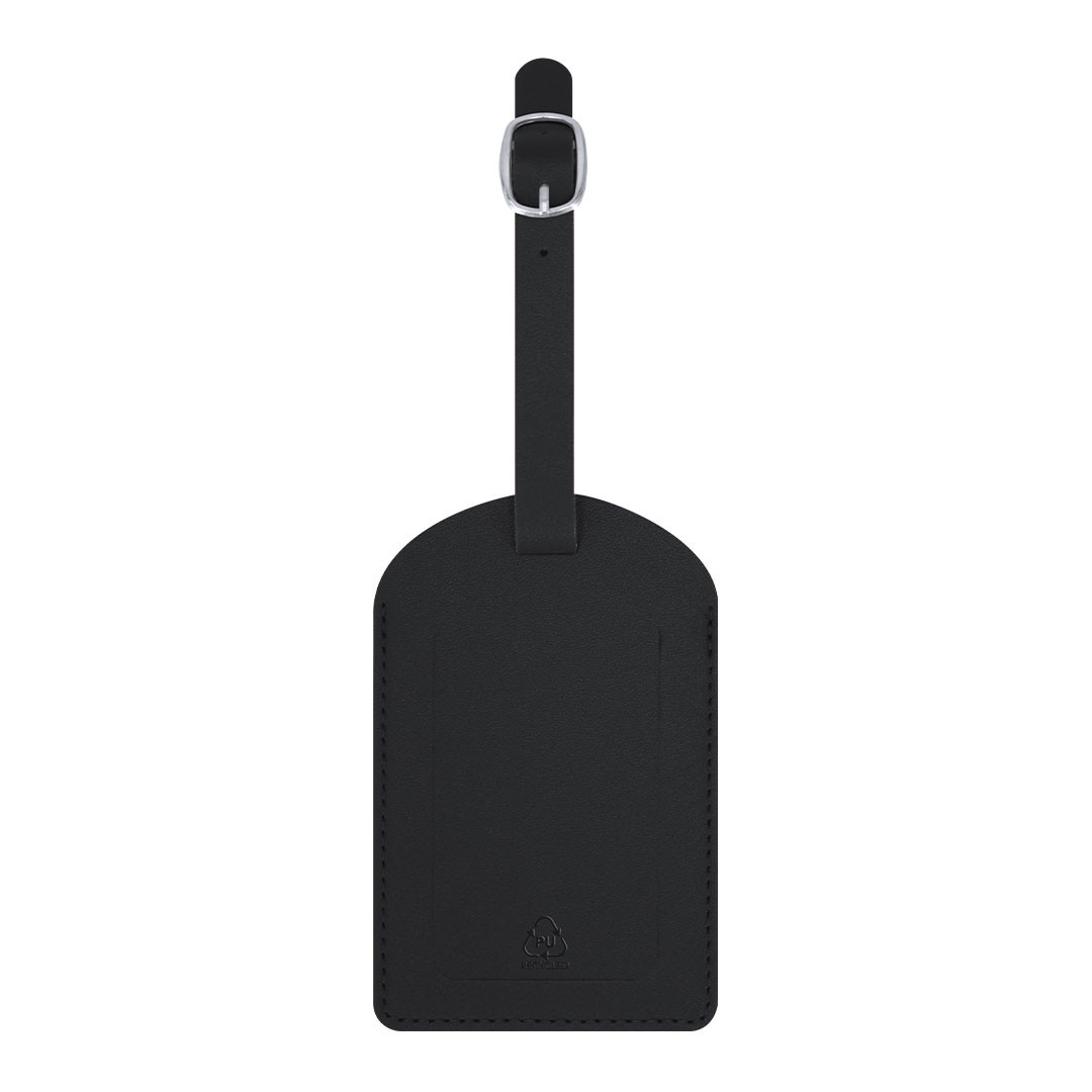 Identificador para maletas fabricado en PU Reciclado. Para enganchar a cualquier maleta gracias a su hebilla ajustable. Con ventana y etiqueta distintiva de PU Reciclado.