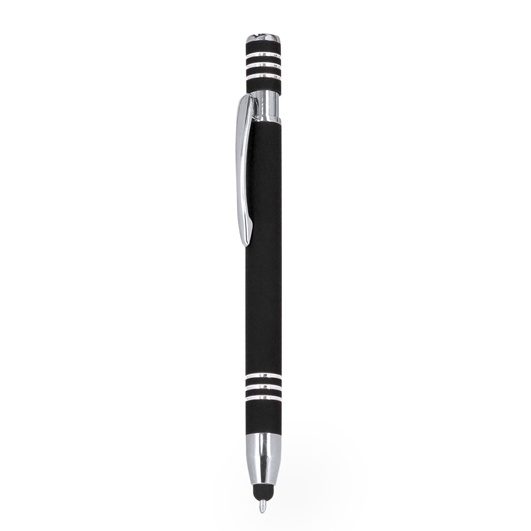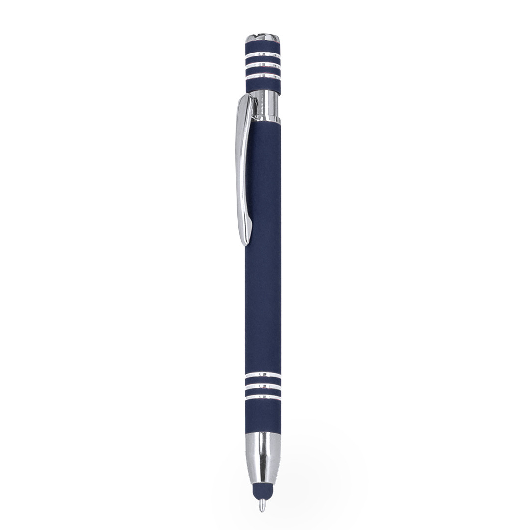 Bolígrafo puntero con mecanismo pulsador, fabricado en aluminio. Cuerpo con acabado de caucho, efecto gomoso. Especialmente diseñado para el marcaje a láser, revelando el logotipo en tono plateado. Incluye accesorios cromados y clip a juego. Tinta azul.
