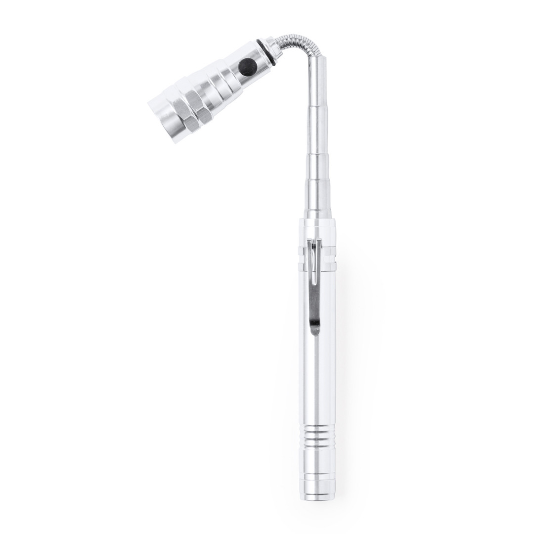 Linterna de aluminio práctica y versátil, con cabezal extensible (triplicando su longitud) y flexible para llegar a todos los lugares, además está equipado con imanes adaptándose a diversas necesidades. Cuenta con 3 potentes LEDs para una iluminación eficiente. Funciona con pilas de botón incluidas y presenta un clip metálico para facilitar su sujeción. Se presenta de manera individual en una caja de diseño kraft.
