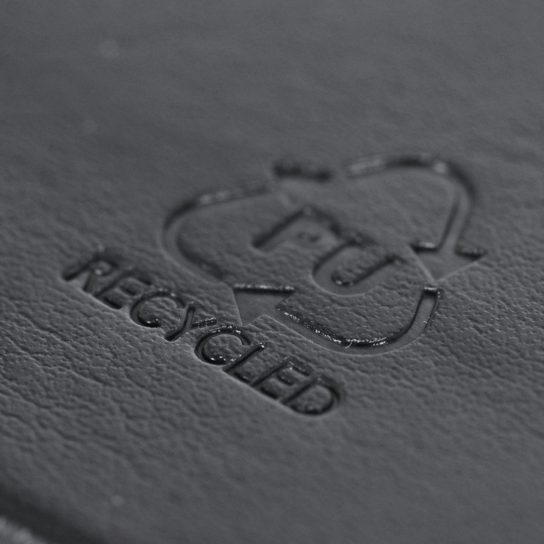 Bloc de notas en tamaño A5 con cubiertas rígidas y suaves, elaborado en PU reciclada y RPET. Marcapáginas en cinta en tres colores diferentes (negro, rojo y gris) para fácil planificación del día a día y doble cinta elástica de cierre a juego. Incluye 128 hojas color blanco con disposición a rayas y un práctico bolsillo de papel para notas sueltas. Ideal para llevar un diario y mantener la planificación durante todo el año. Con distintivo de PU Reciclado.La PU Reciclado destaca por su resistencia y elasticidad. Este material reciclado y reciclable es una opción sostenible que rescata las fibras desechadas en los procesos de fabricación, minimizando así el desperdicio de material y contribuyendo a su vez a reducir el impacto ambiental, manteniendo a la vez sus propiedades originales.