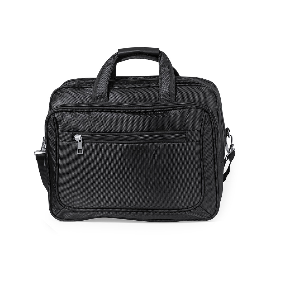 Maletín de alta calidad con cierre de cremallera a juego y en suave y resistente poliéster 1680D de elegantes acabado en color negro. Con 5 bolsillos exteriores con cierre de cremallera y tiradores de alta calidad, compartimento interior acolchado para portátil de hasta 14 pulgadas, cómodas asas de transporte reforzadas en polipiel, además de cinta bandolera ajustable, a juego, con refuerzo acolchado para hombro y cierres de mosquetón.