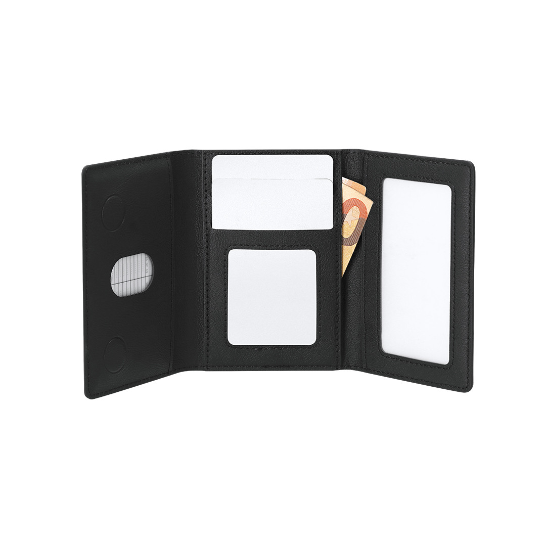 Tarjetero soporte en elegante PU reciclado. Con tarjetero multifuncional que ofrece 6 compartimentos, con cierre plegable magnético. Con sistema de fijación móvil magnético.