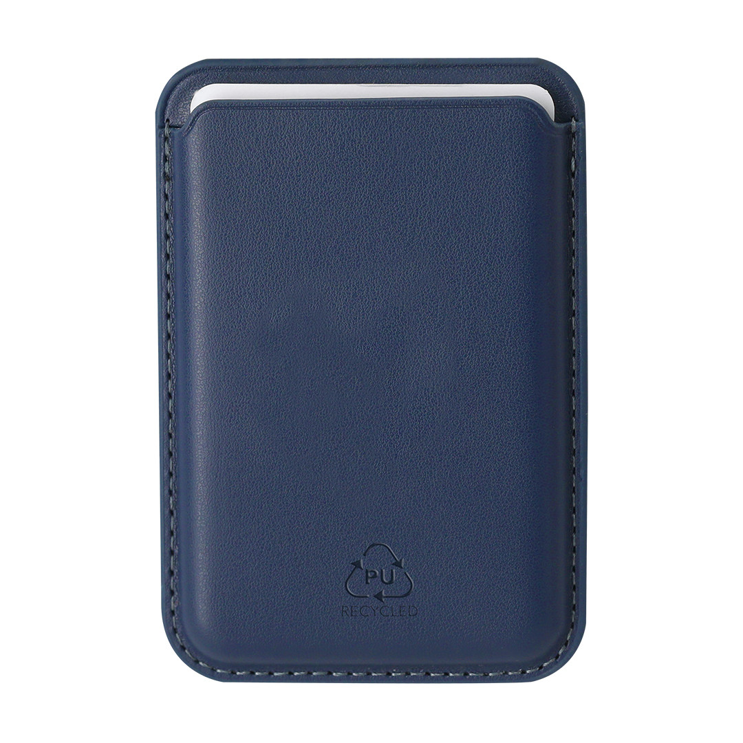Funda tarjetero en elegante PU reciclada. Con sistema de fijación magnética. Incluye orificio en la parte trasera para fácil extracción de tarjetas. Con distintivo PU reciclado.