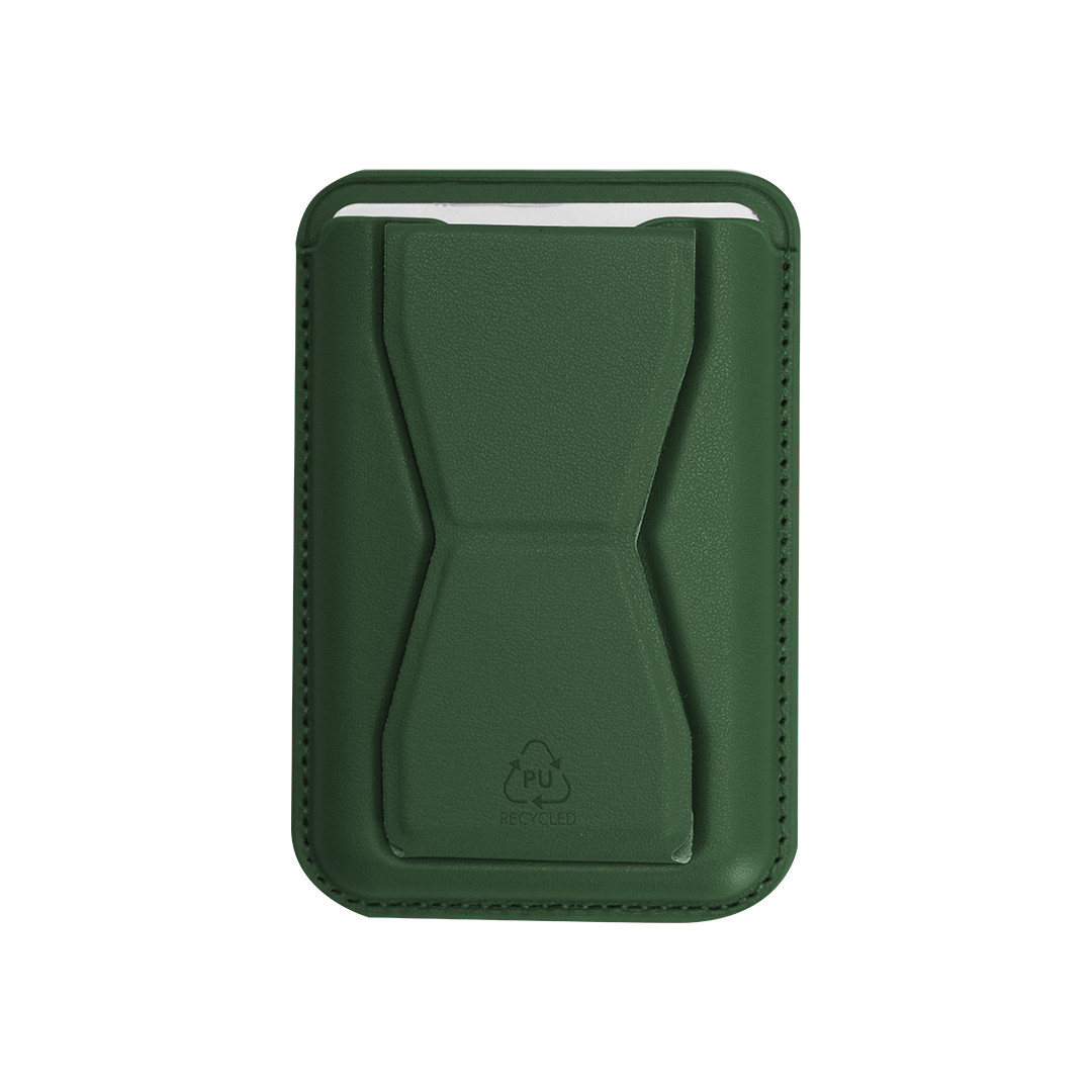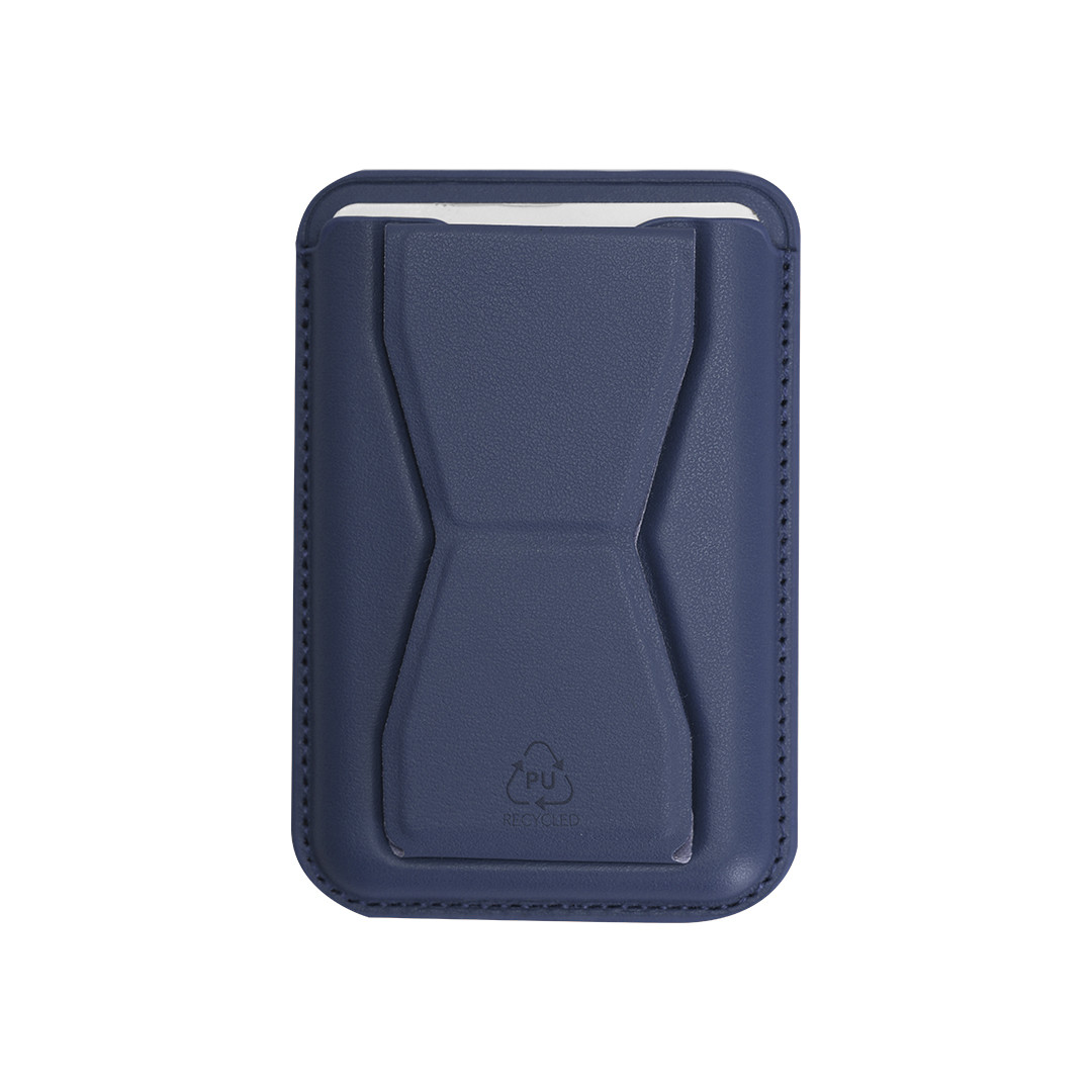 Tarjetero soporte en elegante PU reciclado. Con soporte multifuncional que permite diversas posiciones. Con sistema de fijación magnético. Incluye distintivo PU reciclado.